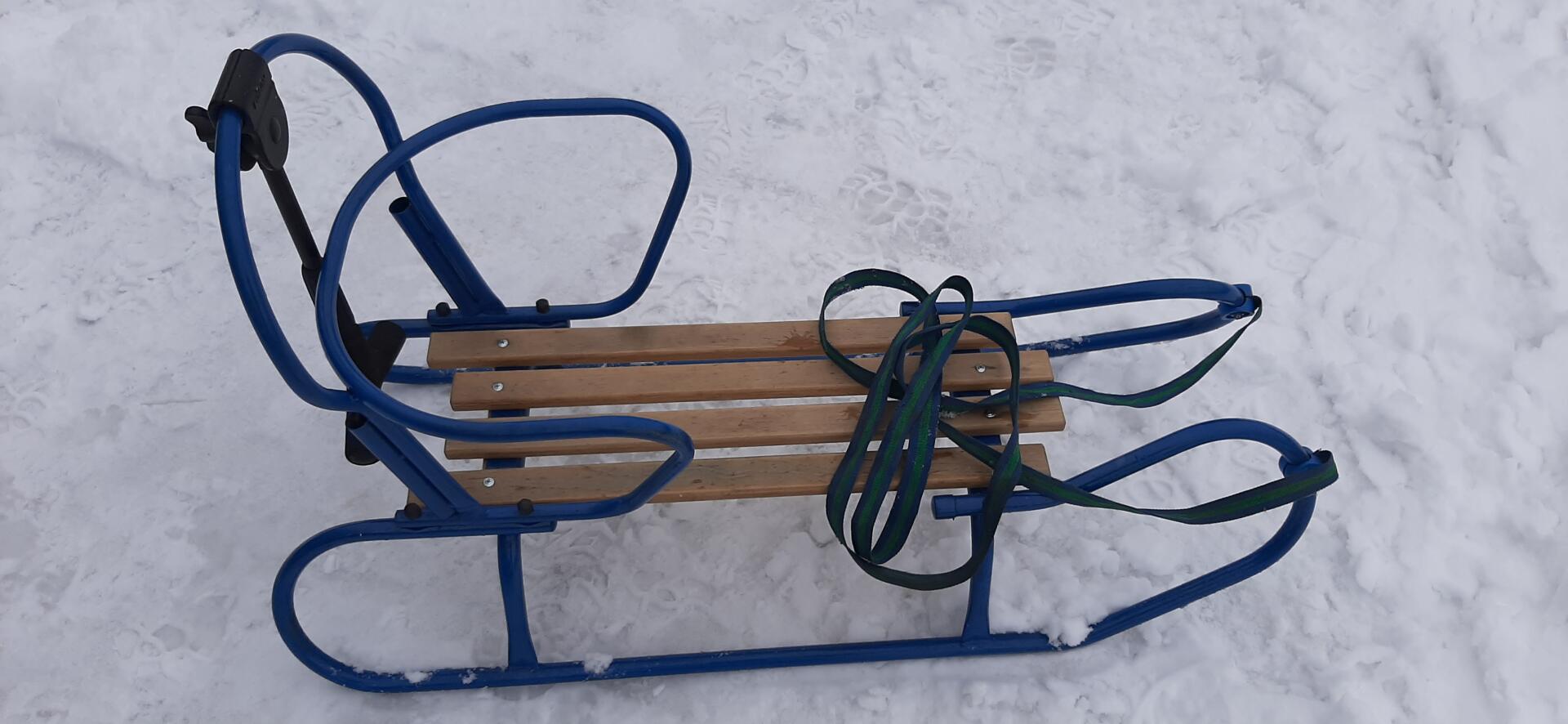 Jest nareszcie prawdziwa zima więc mam prawie nowe metalowe sanki które to posiadają odpinane oparcie oraz zamontowany jest też pchacz który to pomaga w sterowaniu sankami będąc z tyłu pociechy siedzącej przed nami , więc dziecku nie będziemy przeszkadzali w podziwianiu zimowej aury z przodu , jest również taśma do ciągnięcia sanek